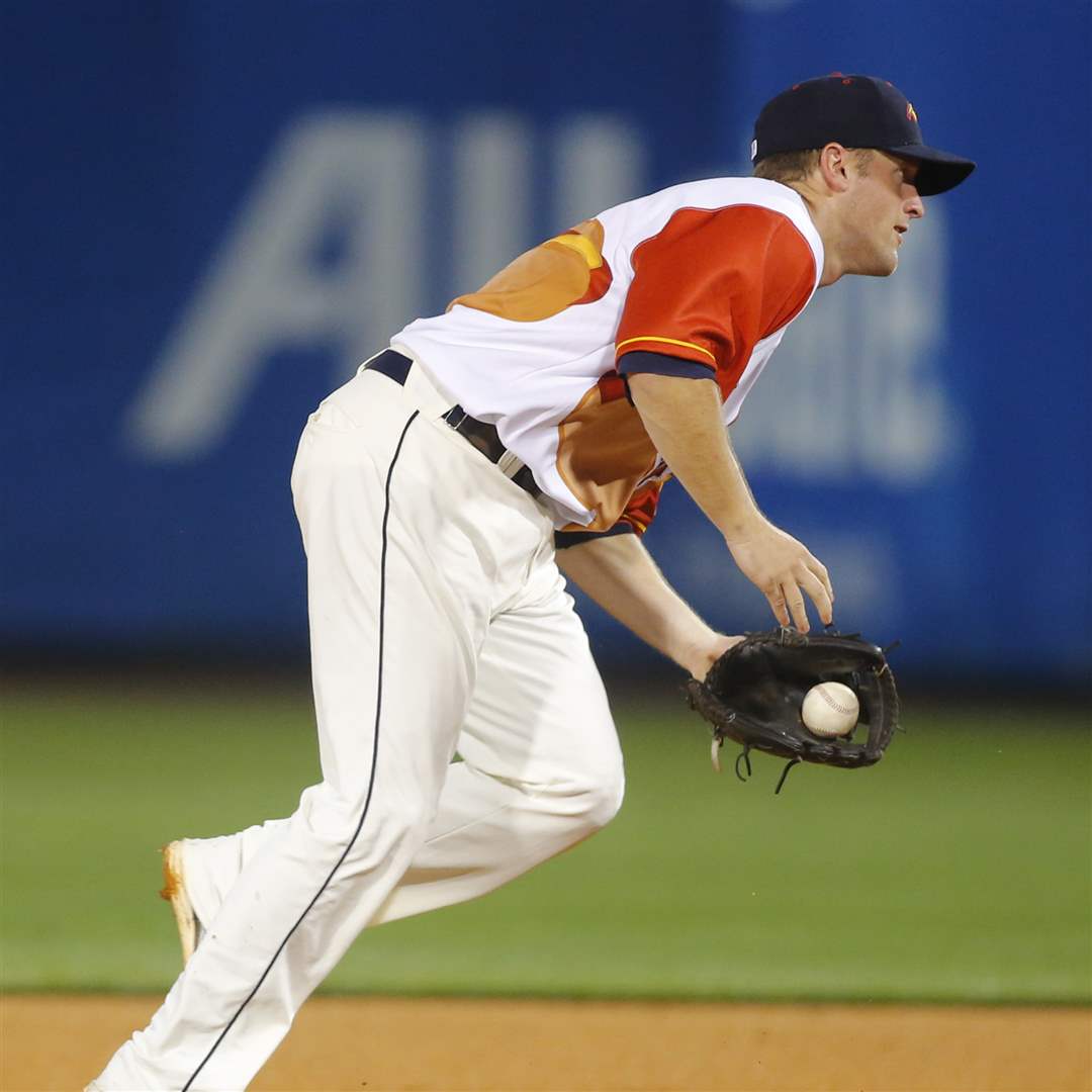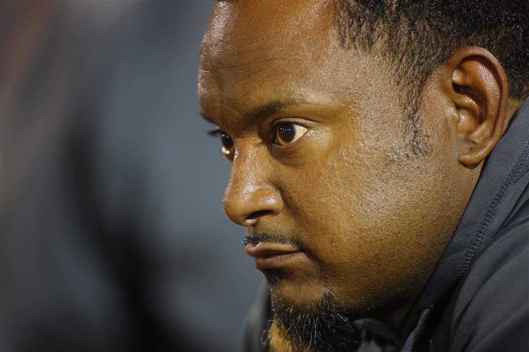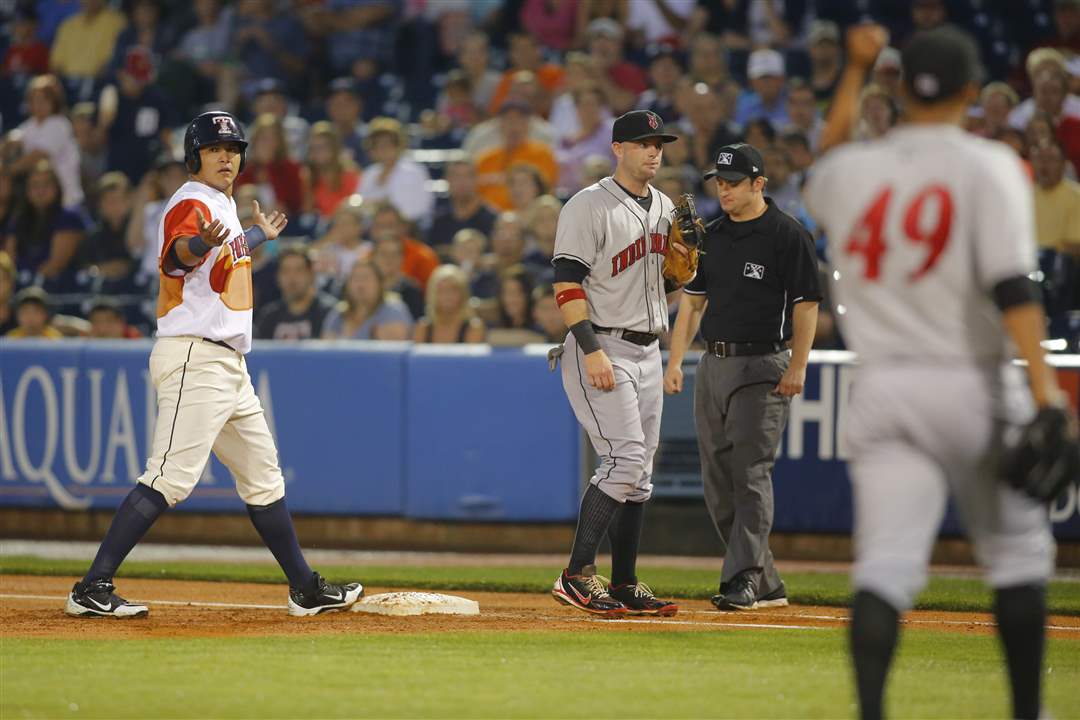 Toledo Mud Hen Avisail Garcia raises his hands in protest after being picked off at first by Indianapolis Indians first baseman Matt Hague.