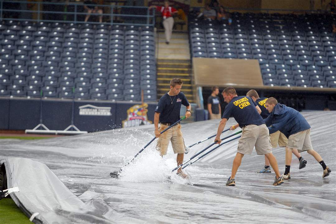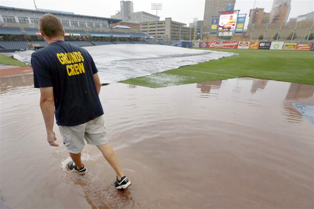 Steve Vonderheide walks through standing water as he and other members of the grounds crew work to clear water from the field.