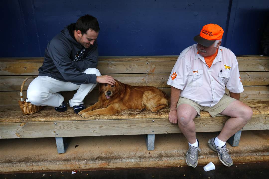 Toledo pitcher Robbie Weinhardt enjoys a chat with Jake the Diamond Dog and his owner Jeff Marchal, Lima, during a rain delay. Jake and Mr. Marchal were to perform at the game. The Blade/Andy Morrison