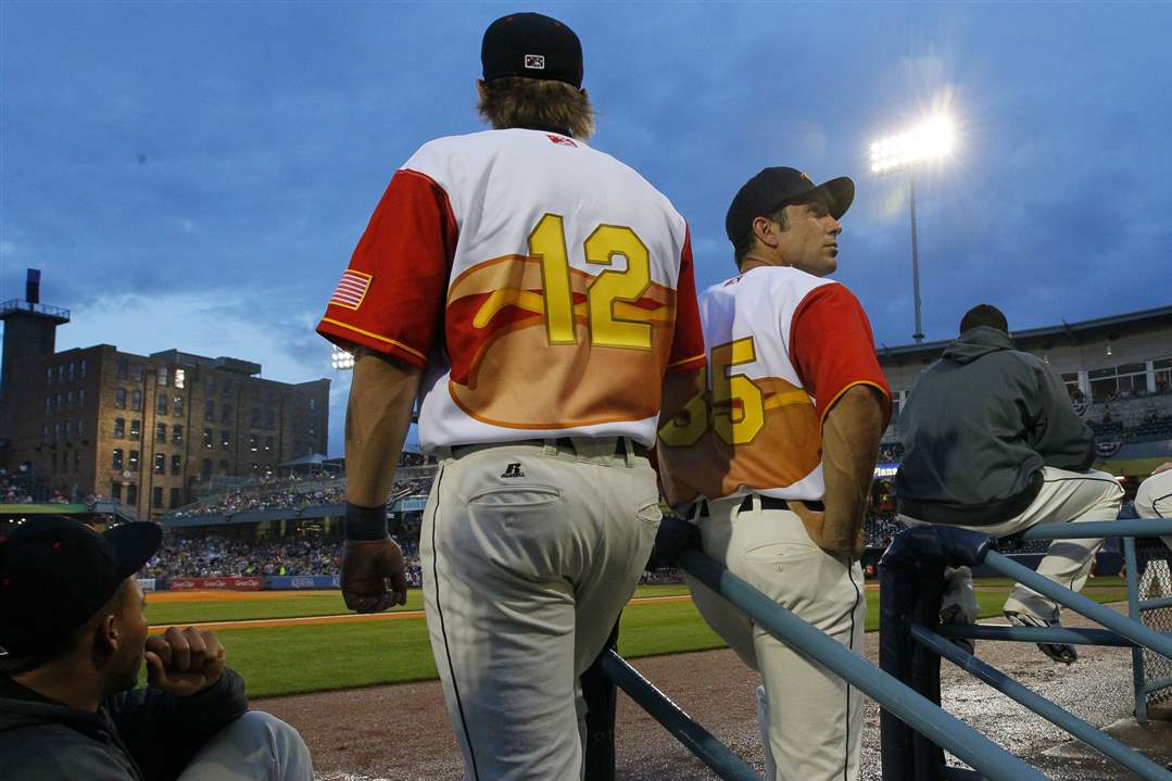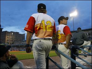 Toledo Mud Hens Jordan Lennerton, left, and Mike Cervenak prepare to take the field.