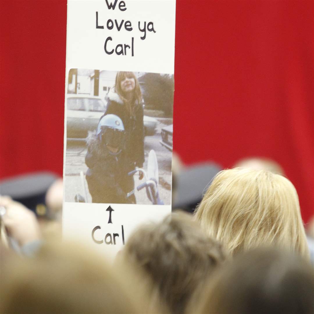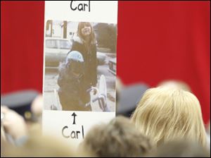 The family of Carl Schwirzinski II holds a sign during the Toledo Police Department graduation that shows they've been supporting him since he was a little kid.