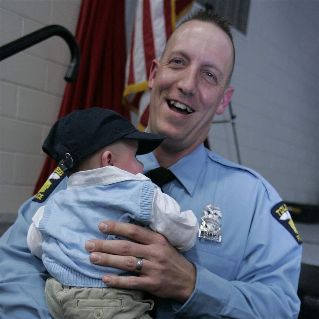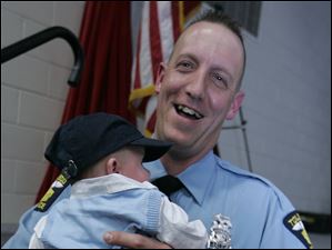 Officer Adam Eilerts holds his son, Connor Eilerts, after graduating. Connor, born Nov. 16, was only 16 days old when his father became a police student.