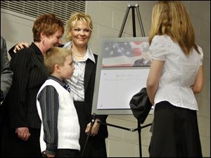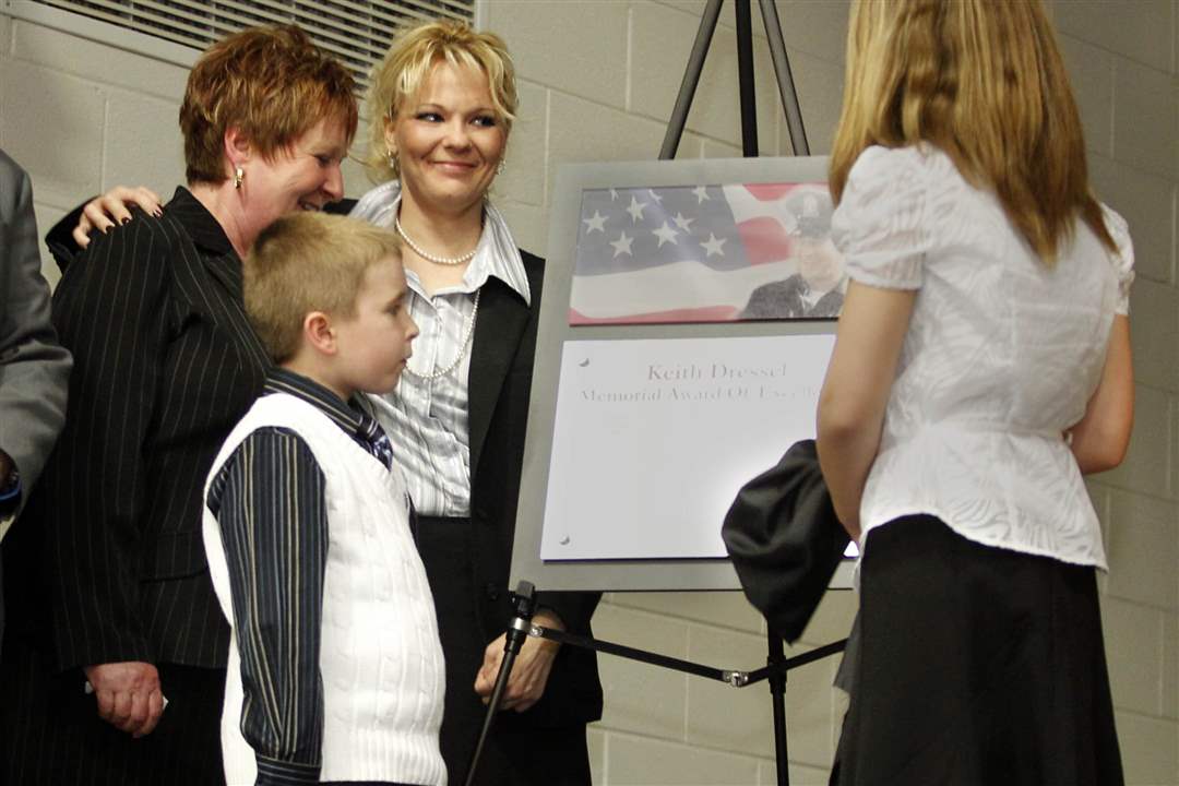 Keith Dressel's family, from left, mother Larraine Dressel, son Noah Dressel, 8, wife Danielle Dressel, and stepdaughter Syndney Durham, examine the memorial award given in remembrance of the detective who died in 2007 in the line of duty.