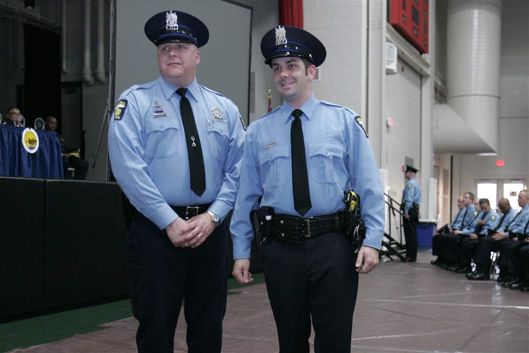 Officer Paul Marchyok, left, congratulates his nephew Scott MacInnis after graduating.