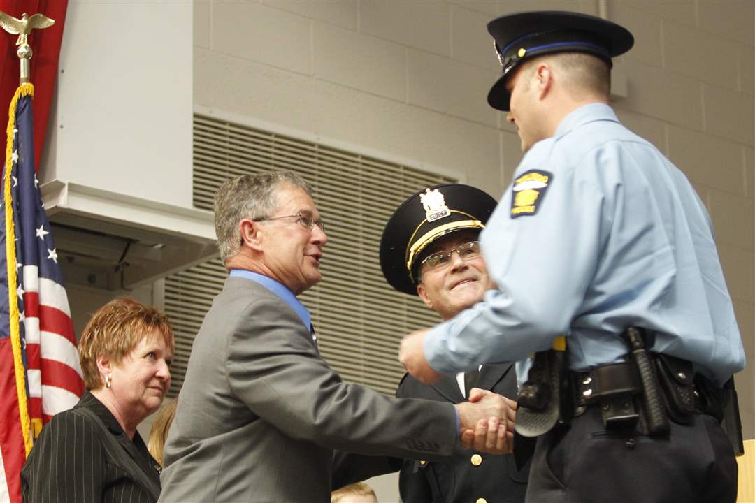 From left, Larraine and Mike Dressel, who are Keith Dressel's parents, with Police Chief Mike Navarre, acknowledge top grad Benjamin Woody at the graduation ceremony. Officer Woody is the first officer to receive the Keith Dressel Memorial Award of Excellence. Detective Dressel was killed in the line of duty in 2007.