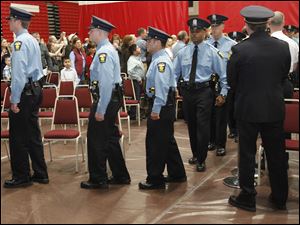 Members of the 58th Basic Police Academy Class state their Oath of Office during graduation at Owens Community College in Perrysburg, Ohio.