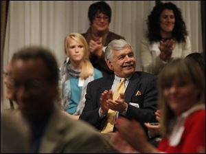 Dr. S. Amjad Hussain, a columnist for The Blade, receives applause at the Toledo Press Club's Touchstone Awards.