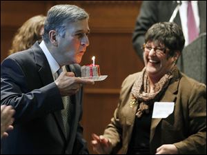 Ron Royhab, winner of the Golden Touchstone award, blows out a birthday candle as Kim Kidwell, of the United Way, looks on. It was Royhab's 69th birthday.