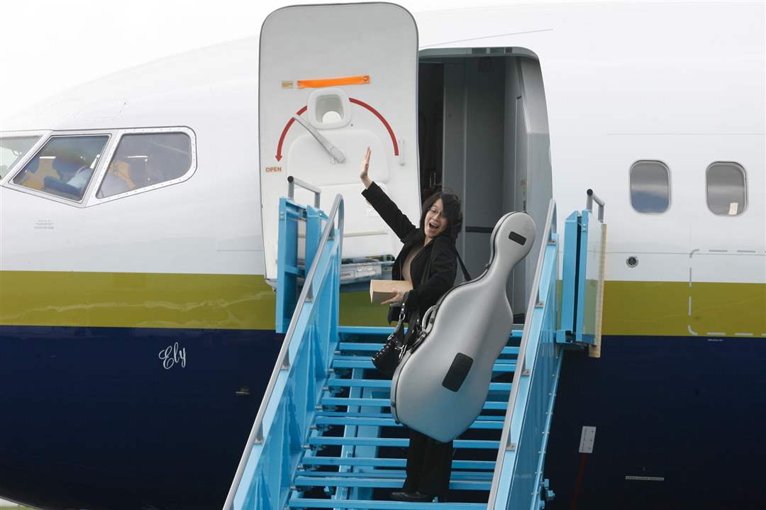 Amy Chang, a cellist with the Toledo Symphony Orchestra, waves as she boards a plane bound for New York City.