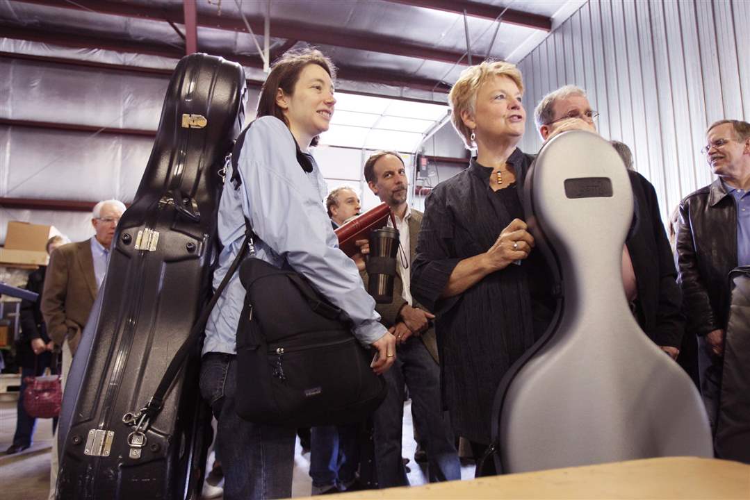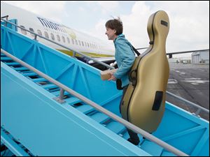Martha Reikon, principal cellist with the Toledo Symphony Orchestra, ascends the stairway to the aircraft with her instrument in tow.