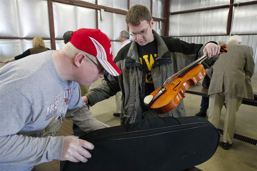 A TSA security officer, left, checks Tim Zeithamel's viola and instrument case prior to boarding the plane.