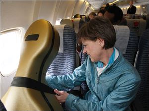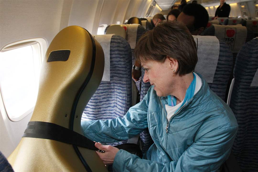 Martha Reikon, principal cellist with the Toledo Symphony Orchestra, fastens aseat belt around her cello before departure to New York.