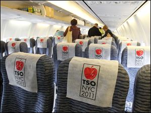 Sheets bearing the logo for the Toledo Symphony Orchestra's trip to Carnegie Hall cover the head rests on the plane.