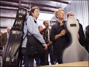 Renee Goubeaux, left, and Sally Dunning, cello players with the Toledo Symphony Orchestra, wait to board a plane at Toledo Express Airport.