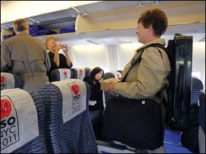 Nora Schankin, a bassoon player with the Toledo Symphony Orchestra, right, boards the plane.
