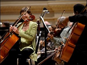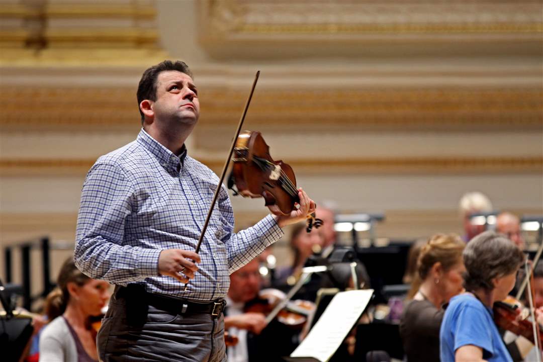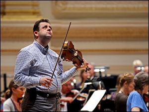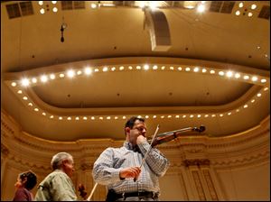 Violinist Vasile Chintoan tests his instrument as he and his fellow musicians with the Toledo Symphony rehearse for their debut Saturday evening at Carnegie Hall in New York.