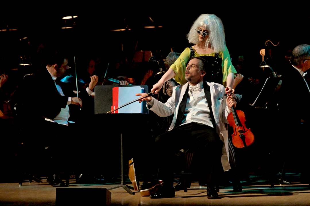 Members of the Toledo Symphony perform "Every Good Boy Deserves Favour" with actors Benjamin Pryor (doctor), Pamela Tomassetti (teacher) at Carnegie Hall in New York. The performance is a Cold War-themed political play.