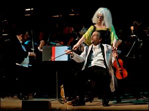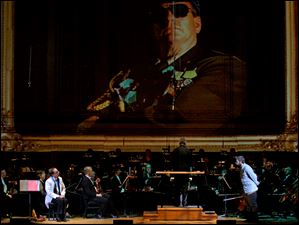 Members of the Toledo Symphony perform "Every Good Boy Deserves Favour" with actors Benjamin Pryor (doctor), left and Pete Cross (Alexander) as a rear projection lights up the stage Saturday at Carnegie Hall in New York.