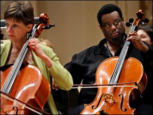 Cello players Martha Reikow, left, and Damon Coleman prepare during rehearsal with the Toledo Symphony.