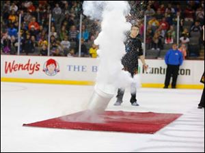 Jamie Pafford, STEM education manager at the Imagination Station, shoots out giant rings of smoke while entertaining the crowd of young fans during the second intermission.
