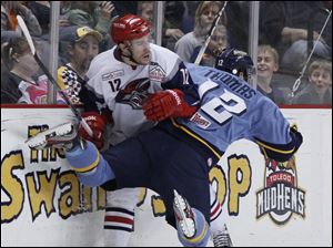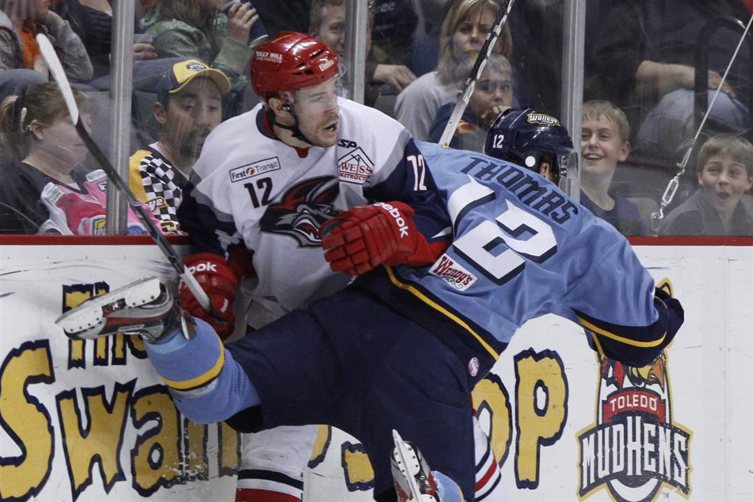 Toledo Walleye player Mike Thomas, 12, crashes into Elmira player Matt CAmpanale, 12, during the first period at the Huntington Center, Friday, March 23, 2012.