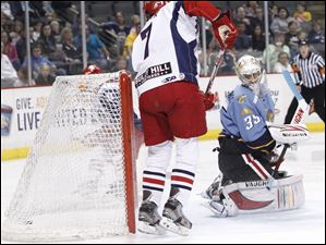 Toledo Walleye goalie Alec Richards pauses after giving up a goal to Elmira during the second period at the Huntington Center, Friday, March 23, 2012.