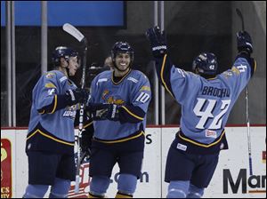 Toledo Walleye player Kyle Page, 4, David Gilbert, 10, and Derek Brochu, 42, celebrate Page's goal against Elmira during the second period at the Huntington Center, Friday, March 23, 2012.