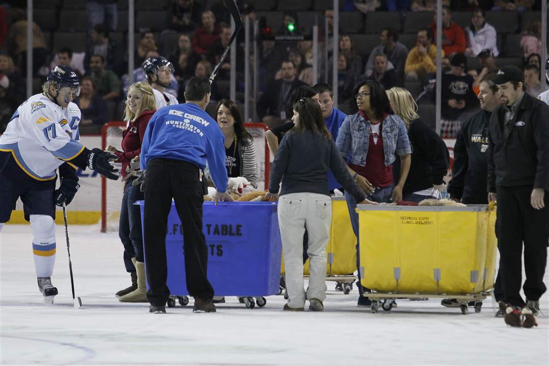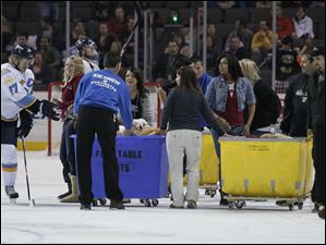 Toledo Walleye player Kyle Rogers (17) helps Walleye ice crew pick up stuffed animals after the Walleye score a first period goal against the Greenville Road Warriors at Huntington Center, Friday.