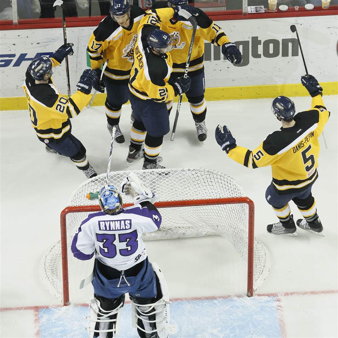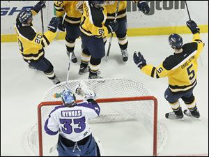 Toledo Walleye players Phil Rauch (20) Kyle Rogers (17) Bryan Rufenach (21) Andrej Nestrasil (11) and Simon Danis-Pepin (5) celebrate Rogers goal beating Reading Royals goalie Jussi Rynnas (33) during the second period.