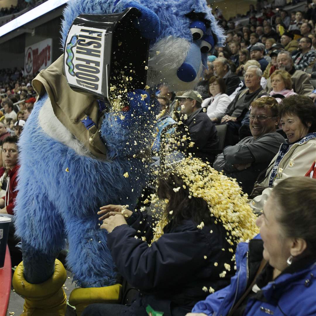 Toledo Walleye mascot Cat Trick dumps a bucket of popcorn on fan Sylvia Spencer as the Walleye play Reading Royals during the third period at Huntington Center, Saturday.