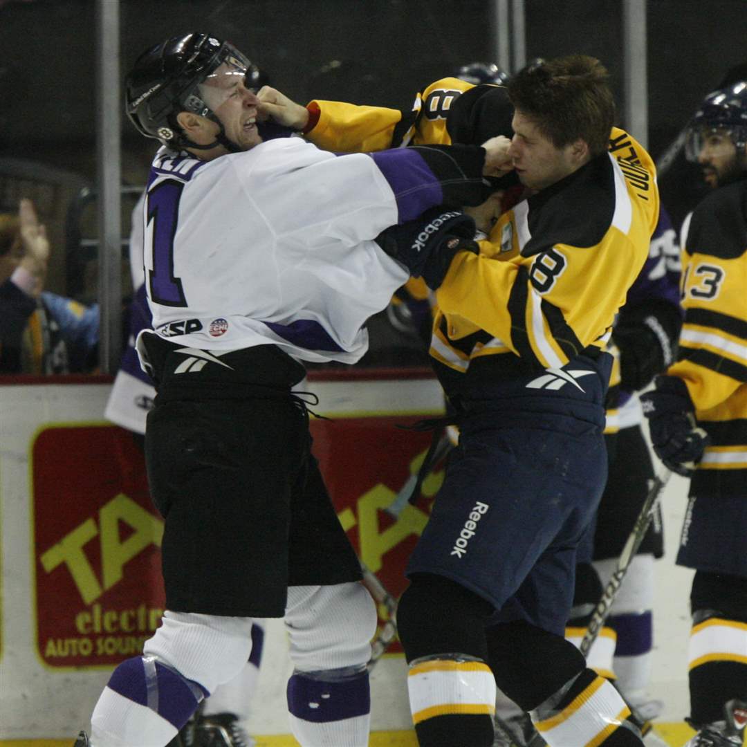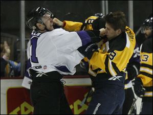 Toledo Walleye player Gleason Fournier (8) right, trades punches with Reading Royals player Everett Sheen (11) during the third period.