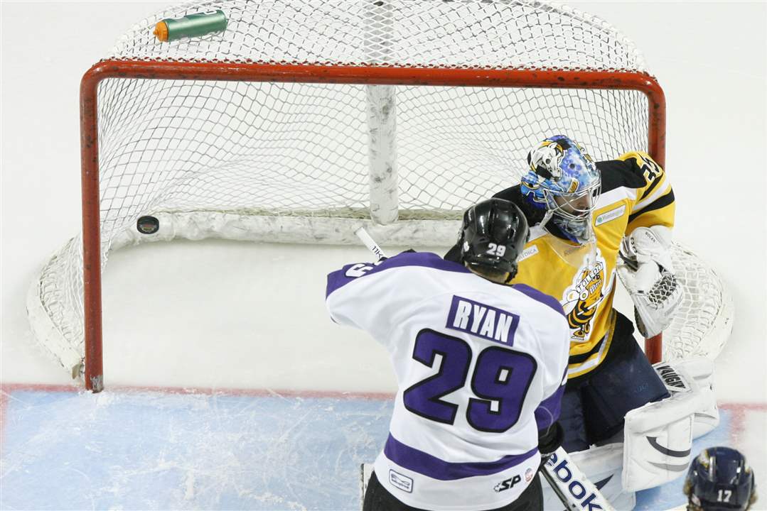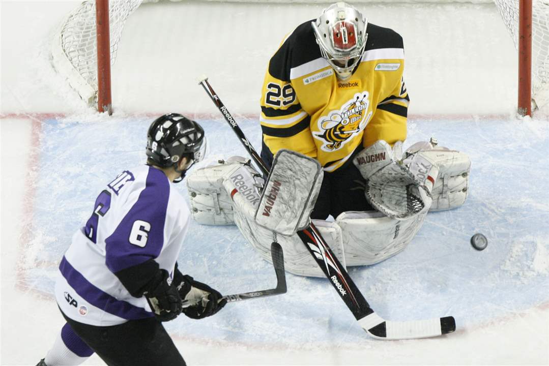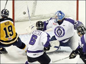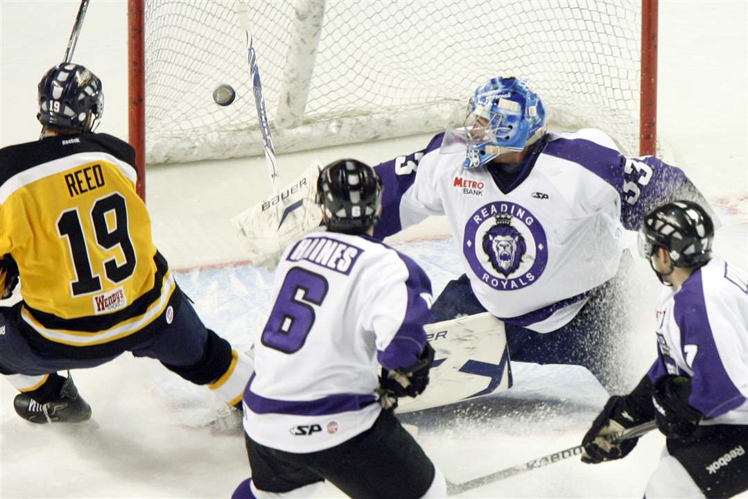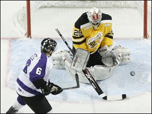 Toledo Walleye goalie Dustin Carlson (29) stops a shot by Reading Royals player Casey Haines (6) after replacing Rob Nolan in the second period.