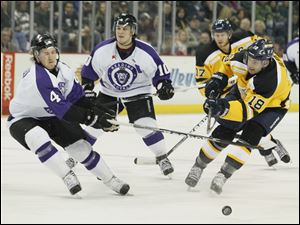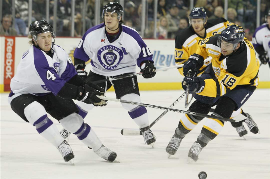 Toledo Walleye player David Gilbert (10) battles for the puck with Reading Royals players Denny Urban (7) and Ryan Cruthers (16) during the third period.
