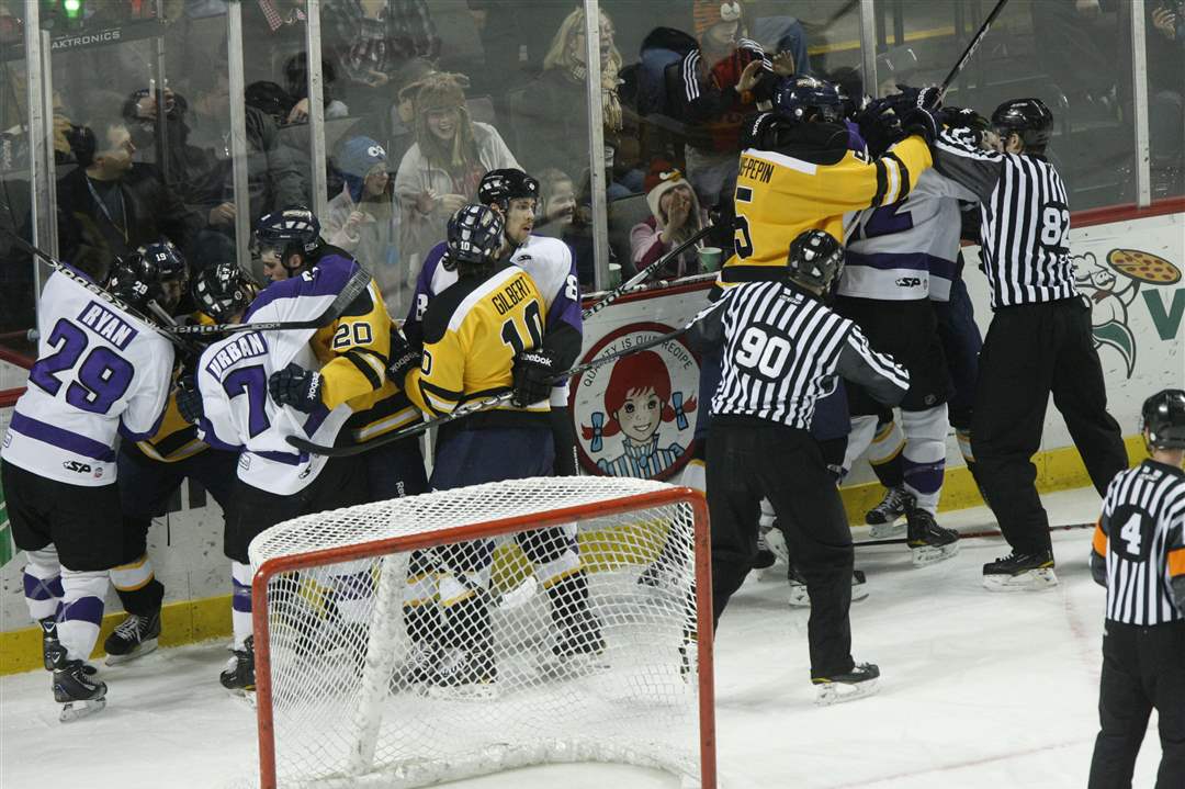 Officials try to separate Toledo Walleye player Phil Rauch (20) and Reading Royals player Olivier Labelle (13) during the second period.
