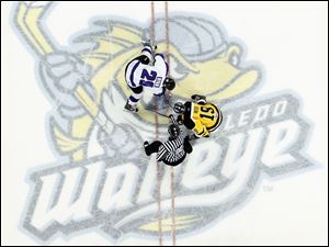 Toledo Walleye player Harrison Reed (19) faces off with Reading Royals player Kenny Ryan (29) during the second period.