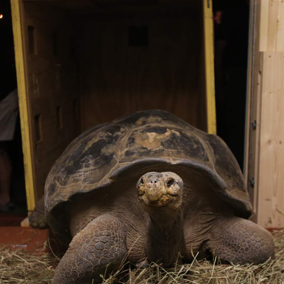 Emerson, a Galápagos tortoise, is delivered and unboxed.