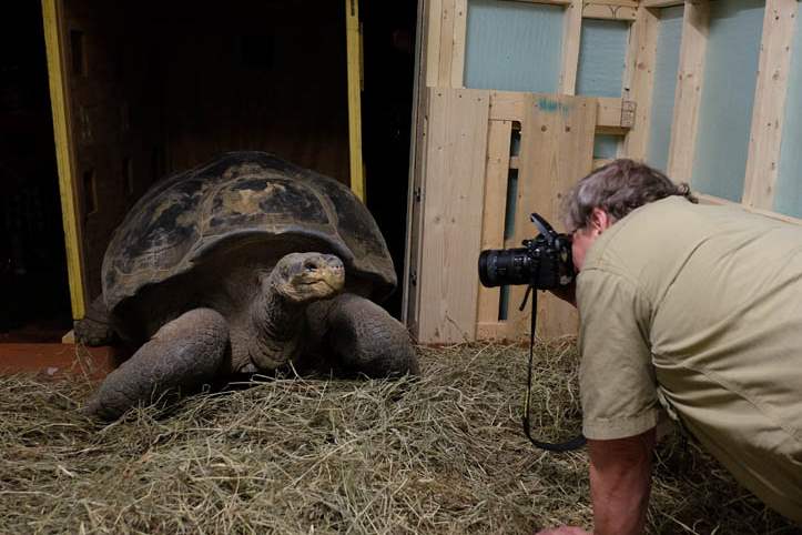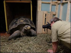 Andy Odum, Toledo Zoo assistant director of animal programs and curator of herpetology, photographs Emerson, a Galpagos tortoise.