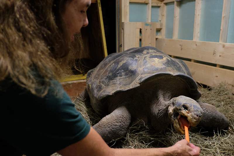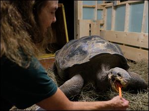 Val Hornyak of the Toledo Zoo feeds Emerson, a Galápagos tortoise, a carrot as he is delivered and unboxed Wednesday, 08/27/14, at the Toledo Zoo in Toledo, Ohio. Emerson is a wild-born tortoise estimated at 100 years old. He is being donated by the San Diego Zoo.