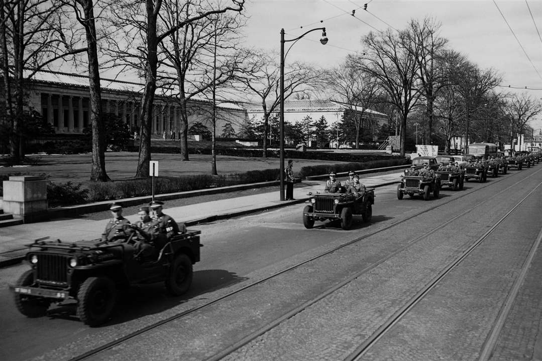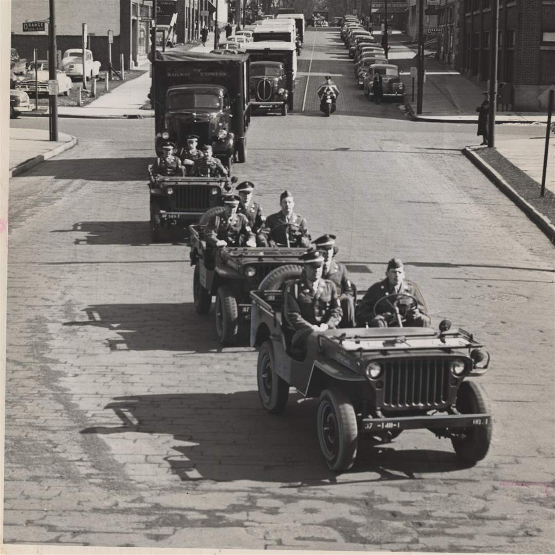Photo shows the convoy that delivered the paintings included in the 1949 European Masterpieces exhibit of paintings that came to Toledo as the last stop of an American tour.