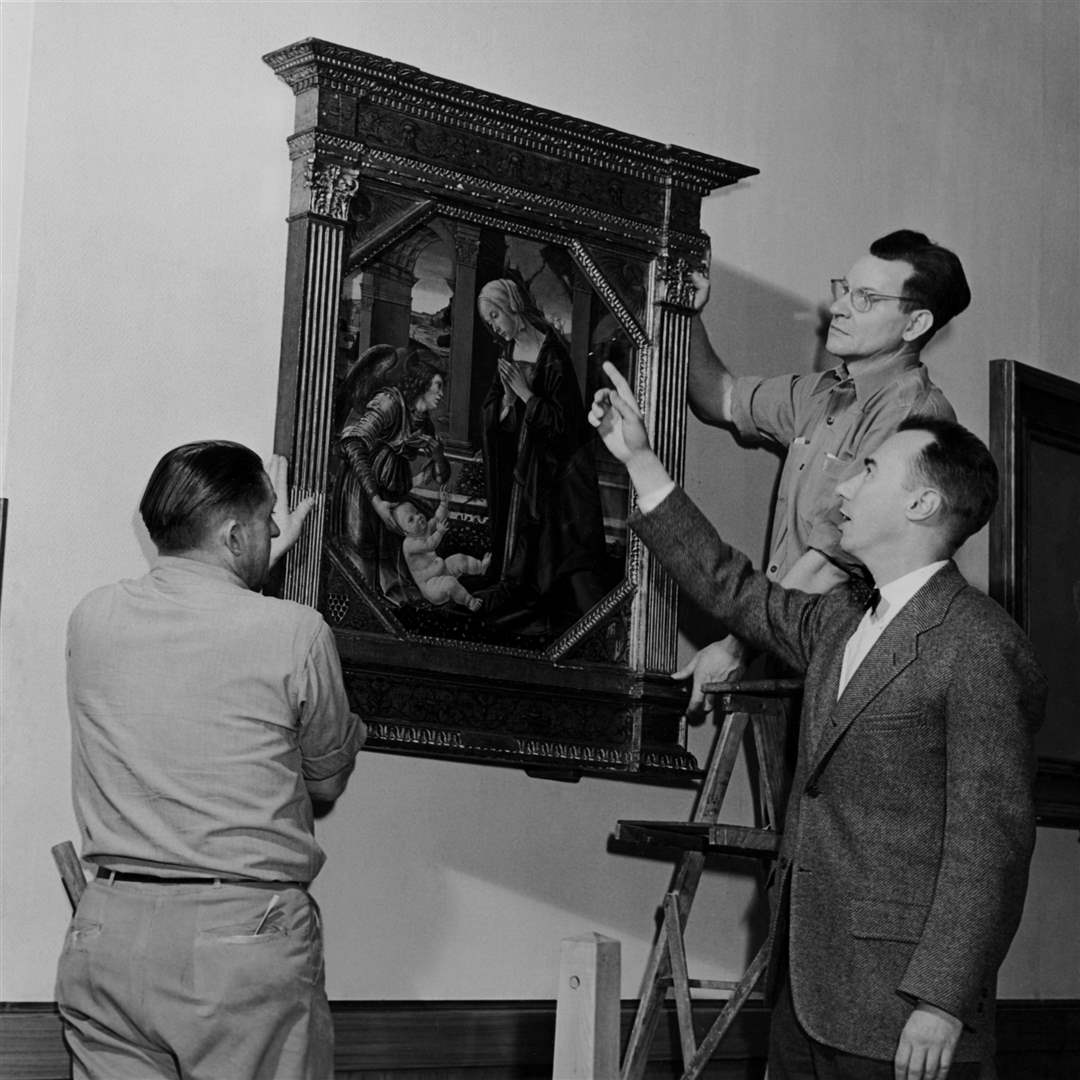 Otto Wittmann of the Toledo Museum of Art points at one of the paintings on display at the museum in 1949.