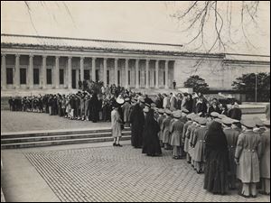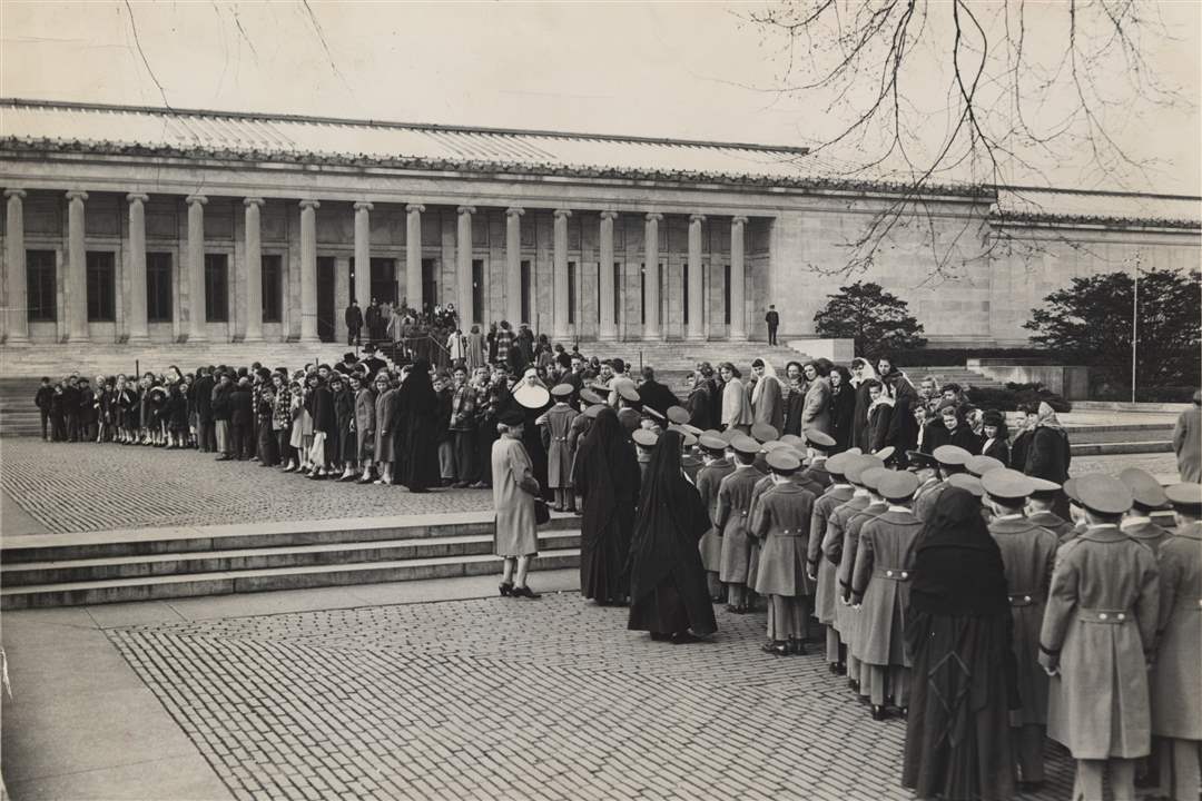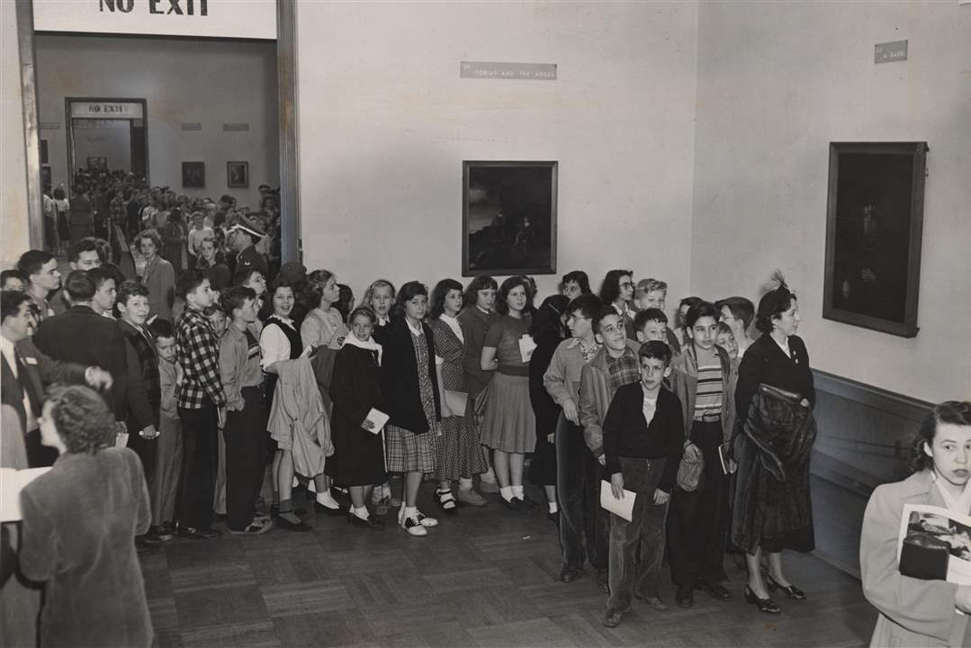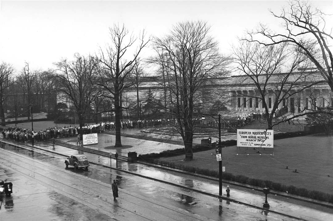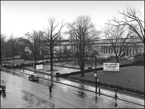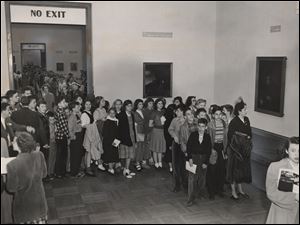 Lines of people waiting to see a 1949 exhibit called European Masterpieces from Berlin Museums wait outside the Toledo Museum of Art.