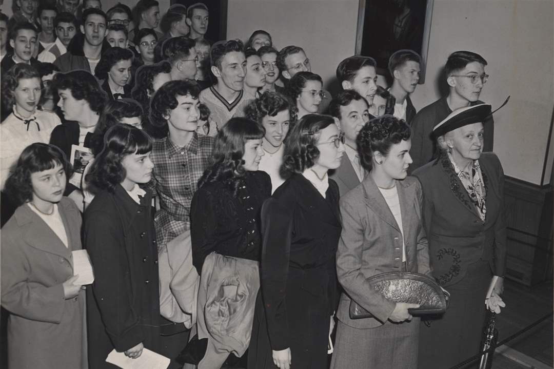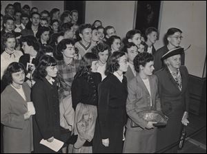 School students and Toledo residents wait in line outside the Toledo Museum of Art to view more than 90 European paintings Nazis had buried deep in a German salt mine. In 1949, more than 100,000 people streamed into the museum in a 10-day exhibit of paintings.