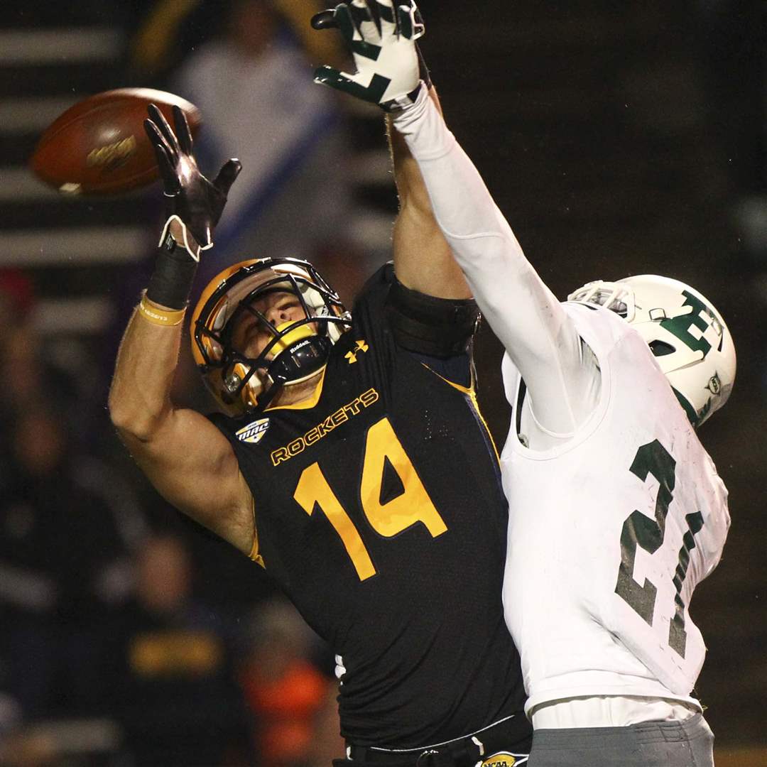 Toledo junior Justin Olack barely misses a pass as Eastern Michigan senior Ja'Ron Gillespie attempts to break it up.