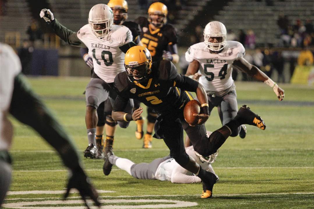 Toledo senior quarterback Terrance Owens runs the ball, dodging several Eastern Michigan defenders.
