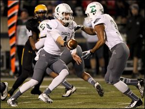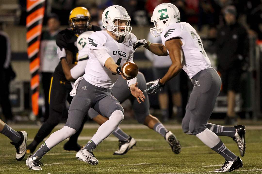 Eastern Michigan freshman Brogan Roback hands off the ball to senior Javonti Greene.