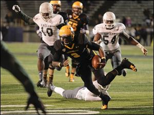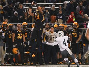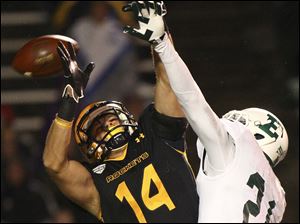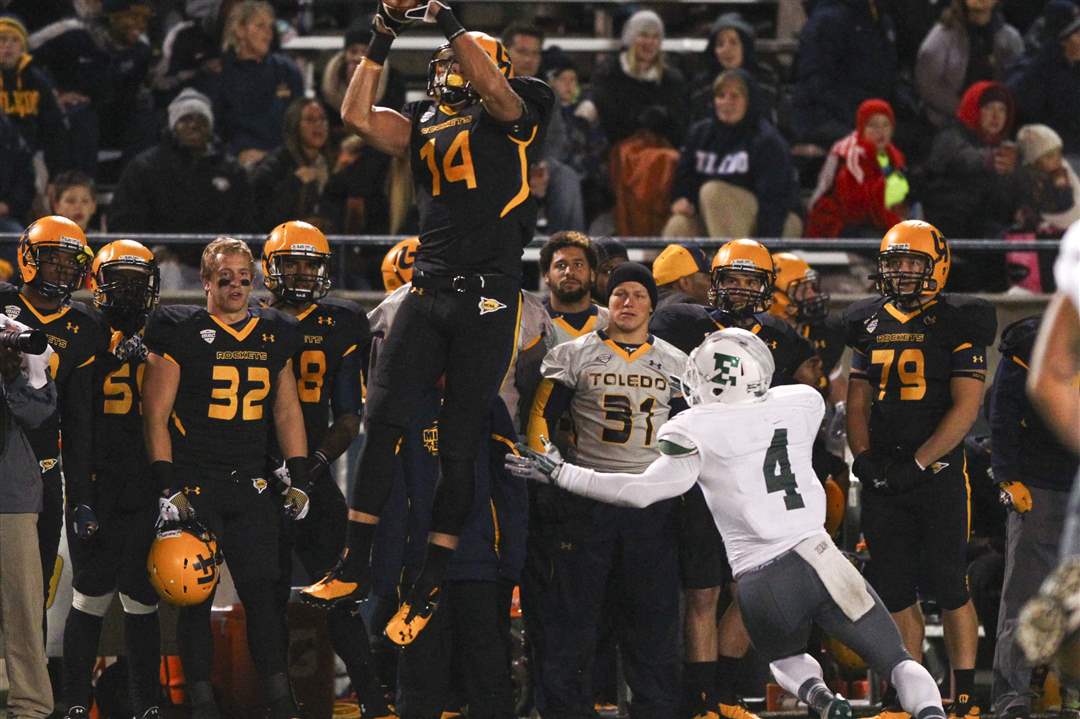Toledo junior Justin Olack jumps to catch a high pass as Eastern Michigan junior Willie Creear attempts to tackle.