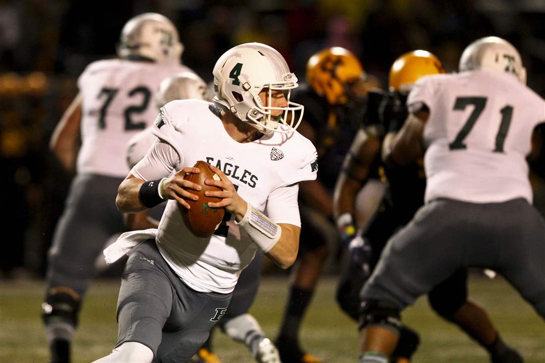 Eastern Michigan freshman quarterback Brogan Roback looks to pass.