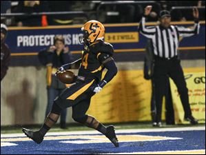 Toledo freshman Damion Jones-Moore runs the ball into the end zone for a touchdown.