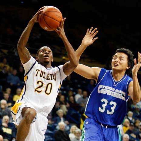 Toledo guard Rian Pearson takes a shot over outstretched Texas A&M-Corpus Christi guard Kennon Dvorak.