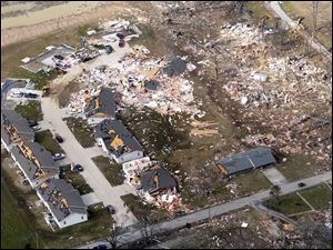 This aerial photo shows damaged homes near the corner of South Water and Birch Streets in Harrisburg, Ill.